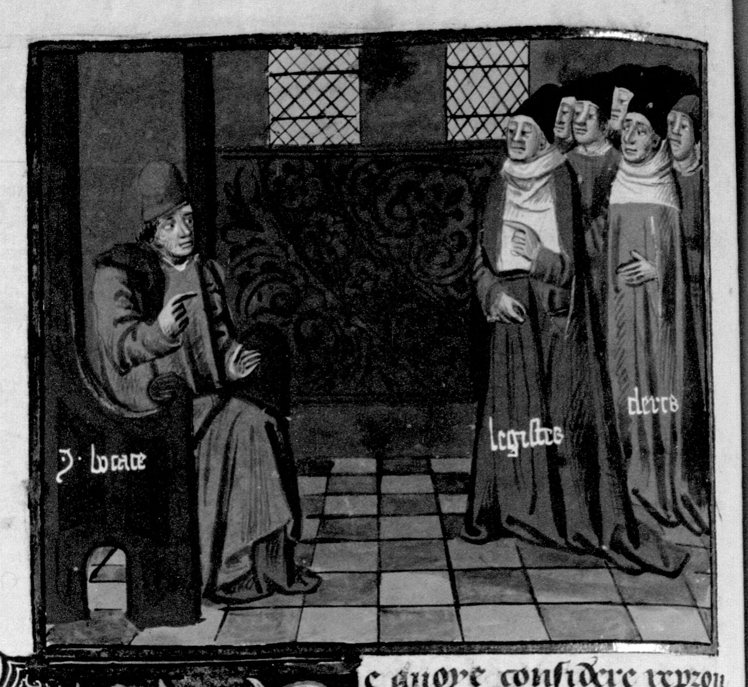 Parigi, Bibliothèque Nationale de France, Fr. 230, f. 81v. Il copista del manoscritto è P. Droulin. Giovanni Boccaccio incontra un gruppo di chierici e legisti.