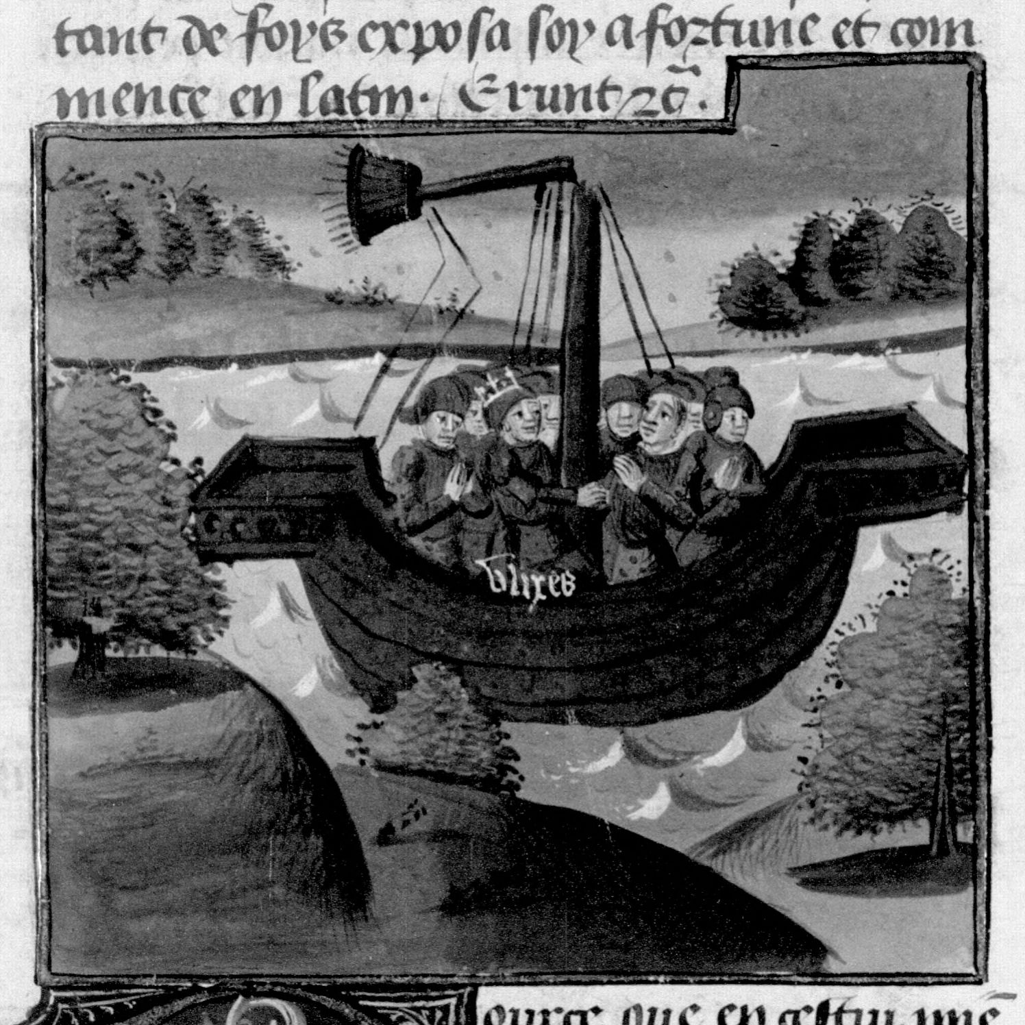Parigi, Bibliothèque Nationale de France, Fr. 230, f. 85v. Il copista del manoscritto è P. Droulin. Ulisse e i suoi compagni vengono colpiti da una tempesta durante la navigazione.