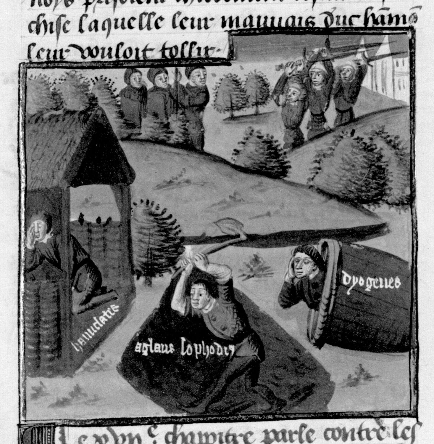 Parigi, Bibliothèque Nationale de France, Fr. 230, f. 89v. Il copista del manoscritto è P. Droulin. Amiclate, Agalao e Diogene dimostrano i benefici di una vita vissuta in povertà.
