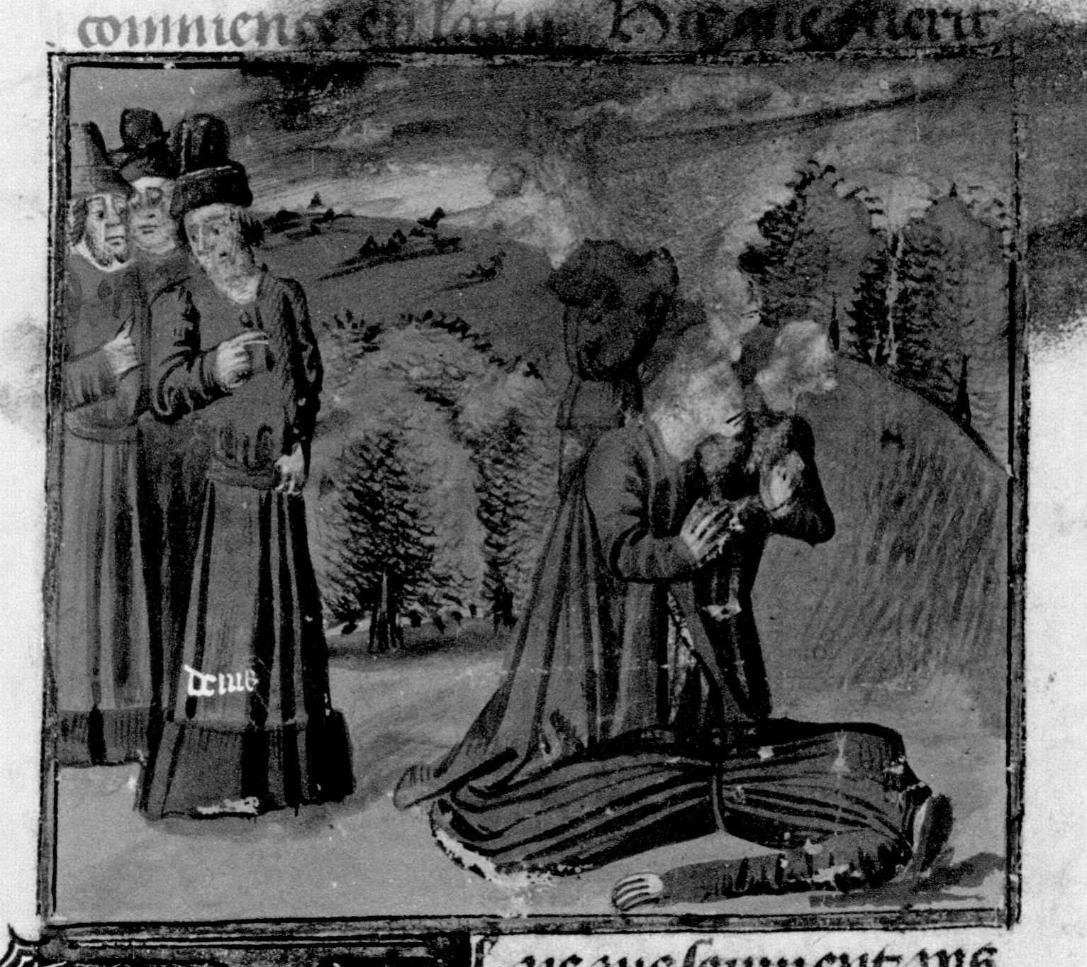 Parigi, Bibliothèque Nationale de France, Fr. 230, f. 98v. Il copista del manoscritto è P. Droulin. Tre uomini vengono decapitati per ordine di Dionigi, tiranno di Siracusa.
