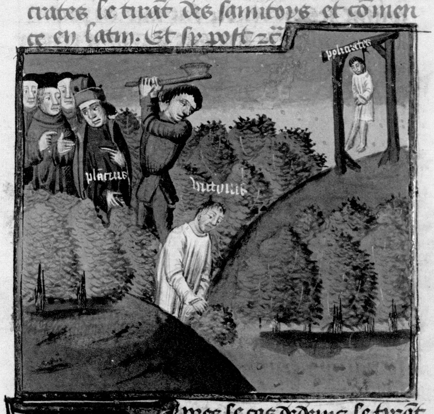 Parigi, Bibliothèque Nationale de France, Fr. 230, f. 100r. Il copista del manoscritto è P. Droulin. Il console Plauzio fa decapitare Vitruvio, capo dei privernati; Policrate, tiranno di Samo, viene impiccato.