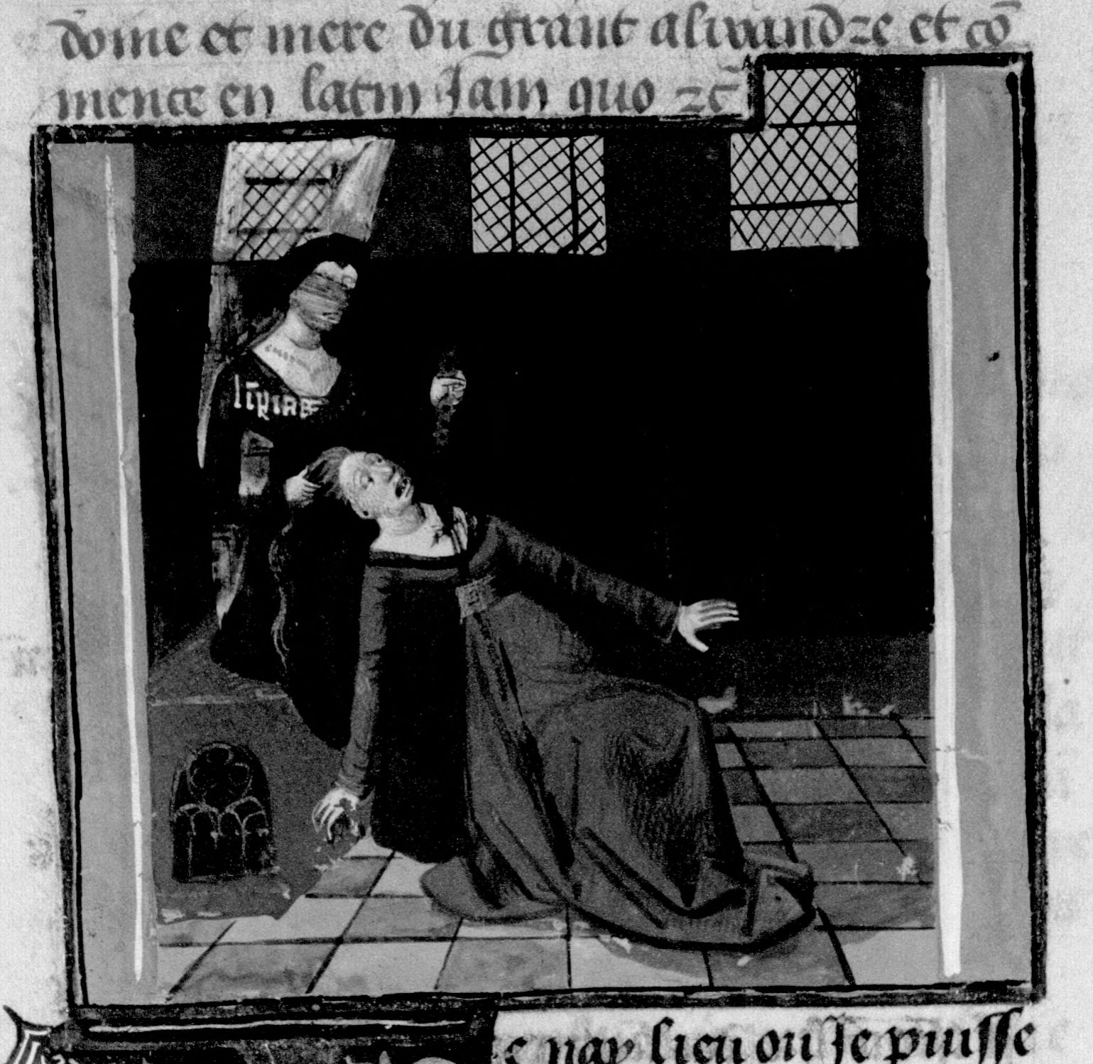 Parigi, Bibliothèque Nationale de France, Fr. 230, f. 110v. Il copista del manoscritto è P. Droulin. Olimpiade uccide la figlia di Cleopatra.