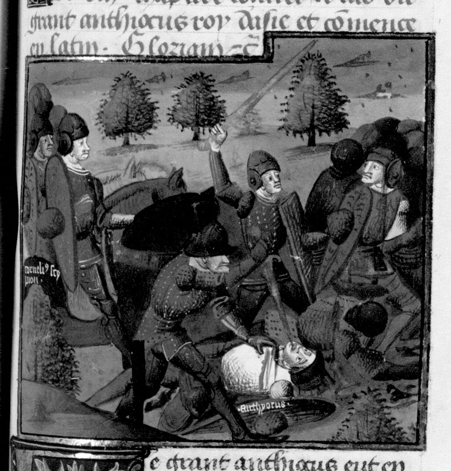 Parigi, Bibliothèque Nationale de France, Fr. 230, f. 139r. Il copista del manoscritto è P. Droulin. Cornelio Scipione sconfigge l'esercito di Antioco il Grande.