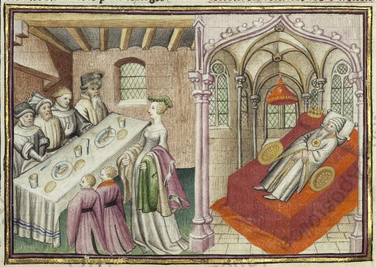 Maestro della Cité des Dames (1414-1419), La moglie di messer Torello offre doni al Saladino e ai suoi compagni; messer Torello giace sul letto addormentato