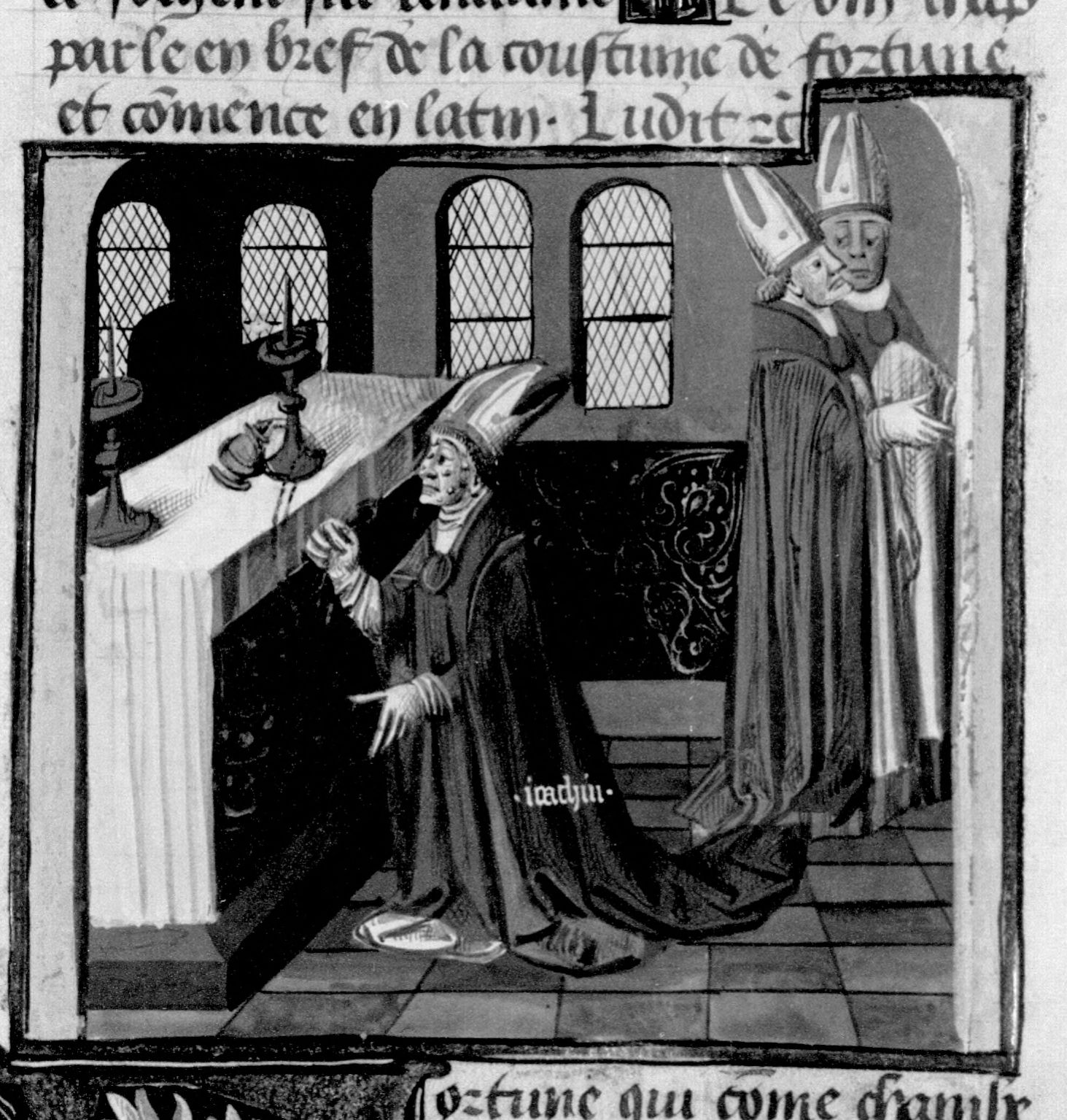 Parigi, Bibliothèque Nationale de France, Fr. 230, f. 146r. Il copista del manoscritto è P. Droulin. Alcimo, contagiato dalla lebbra, offre dell'incenso ad un altare.