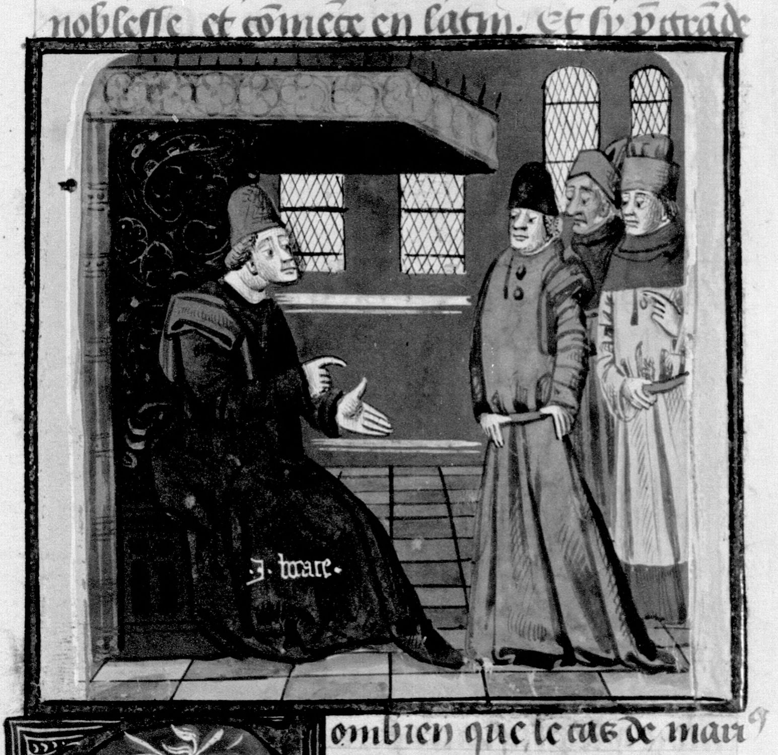 Parigi, Bibliothèque Nationale de France, Fr. 230, f. 162r. Il copista del manoscritto è P. Droulin. Giovanni Boccaccio incontra tre uomini colpiti dalla sfortuna.