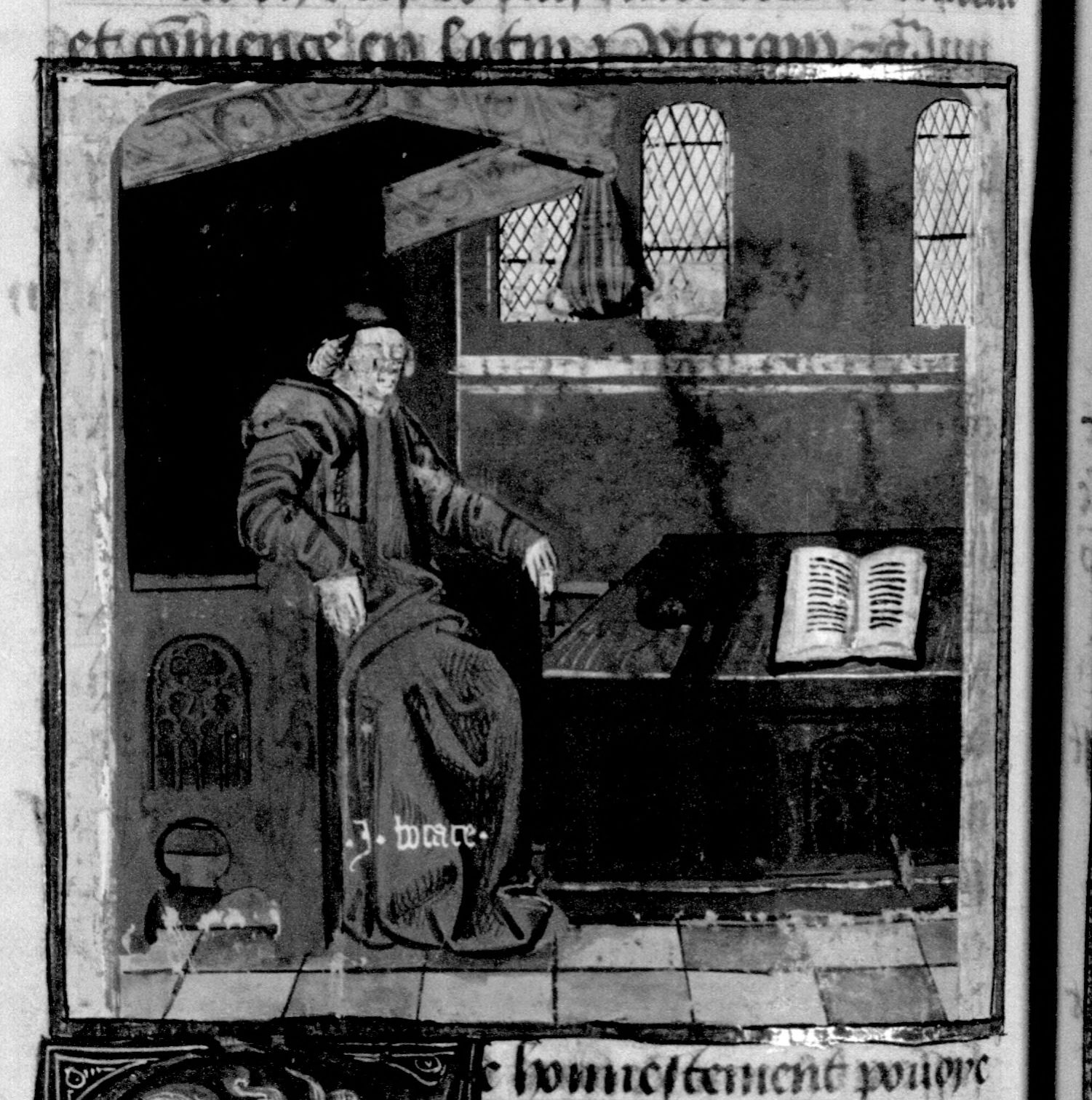 Parigi, Bibliothèque Nationale de France, Fr. 230, f. 175v. Il copista del manoscritto è P. Droulin. Giovanni Boccaccio siede nel suo studio.