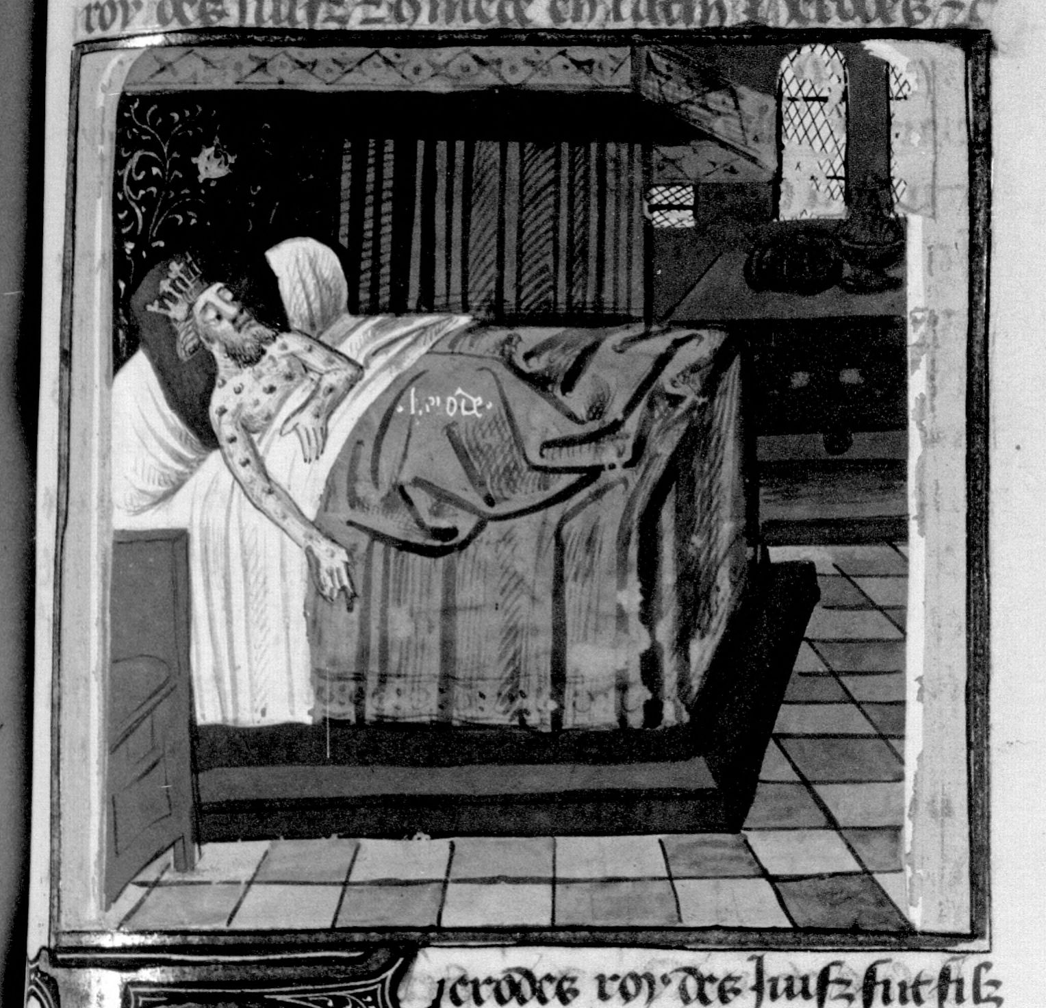 Parigi, Bibliothèque Nationale de France, Fr. 230, f. 188r. Il copista del manoscritto è P. Droulin. Erode giace a letto in fin di vita, malato di cancrena.