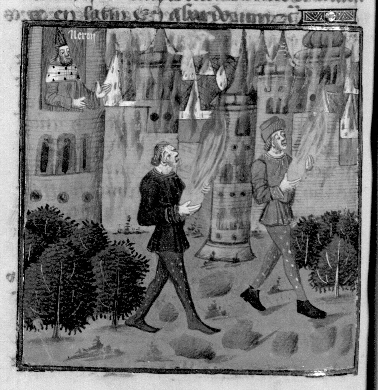 Parigi, Bibliothèque Nationale de France, Fr. 230, f. 195v. Il copista del manoscritto è P. Droulin. Nerone ordina l'incendio di Roma.