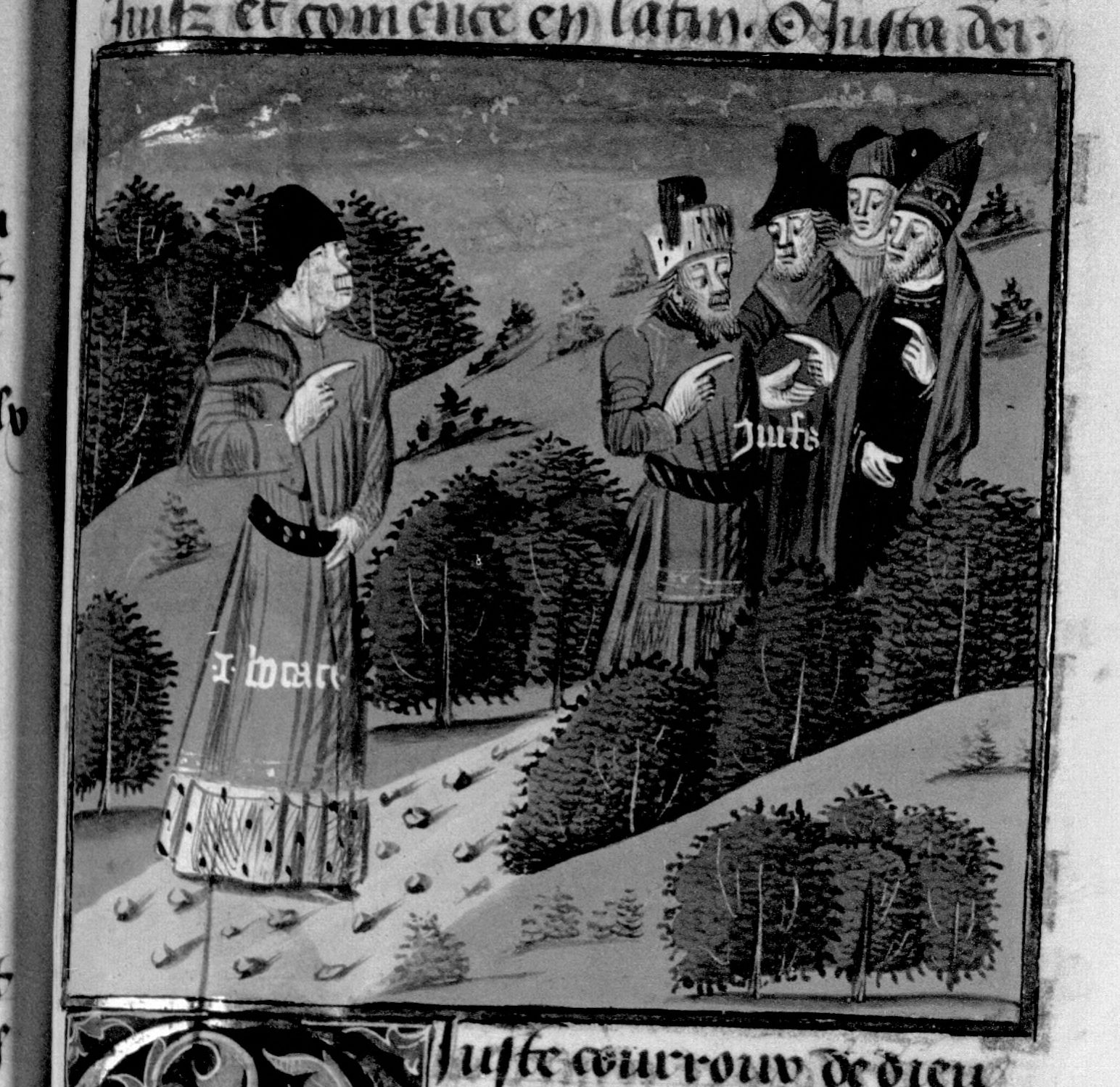 Parigi, Bibliothèque Nationale de France, Fr. 230, f. 208r. Il copista del manoscritto è P. Droulin. Giovanni Boccaccio incontra alcuni Ebrei.