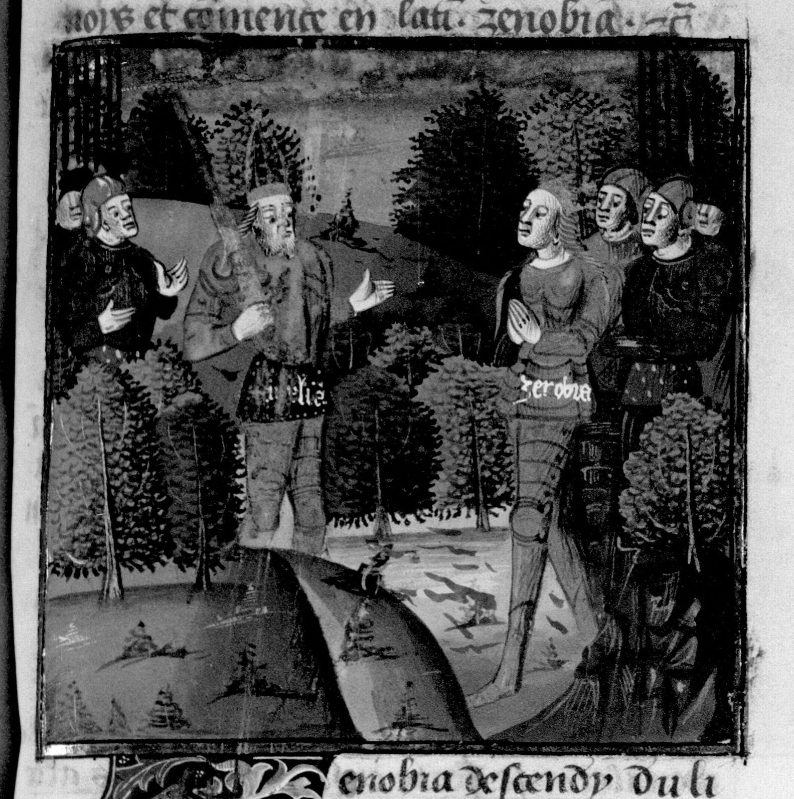 Parigi, Bibliothèque Nationale de France, Fr. 230, f. 218r. Il copista del manoscritto è P. Droulin. Zenobia si arrende all'imperatore Aureliano.
