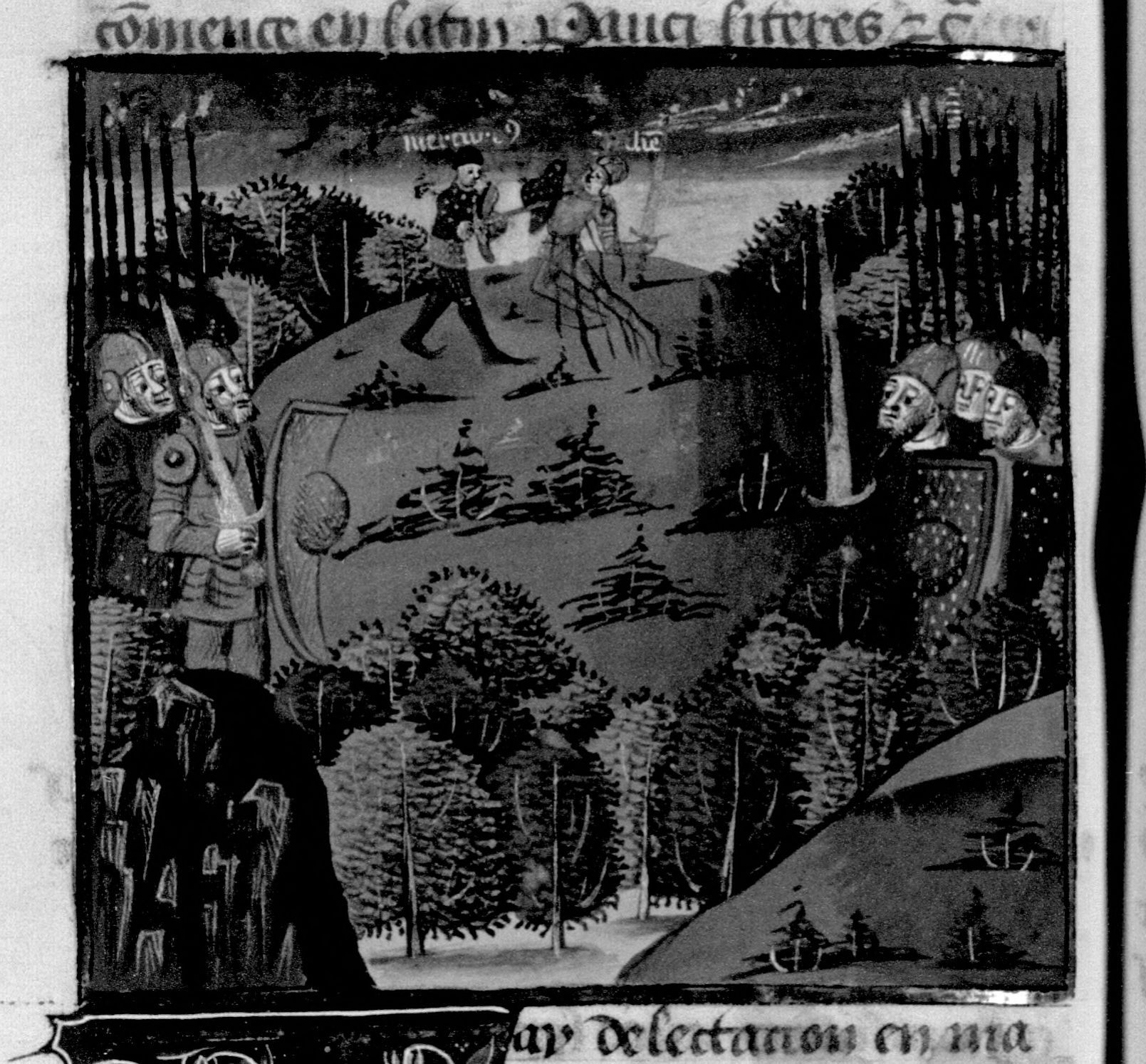Parigi, Bibliothèque Nationale de France, Fr. 230, f. 224v. Il copista del manoscritto è P. Droulin. Giuliano l'Apostata affronta l'esercito dei Parti; Giuliano l'Apostata viene trafitto da Mercurio.
