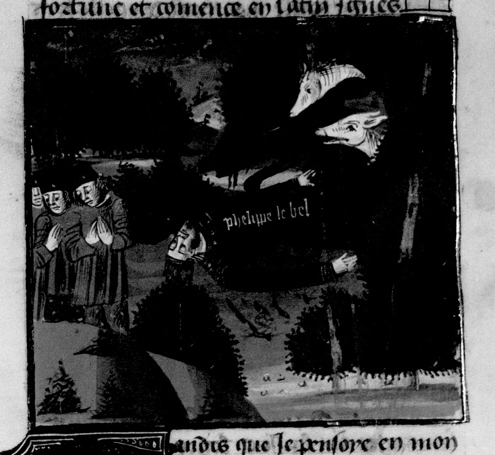 Parigi, Bibliothèque Nationale de France, Fr. 230, f. 266v. Il copista del manoscritto è P. Droulin. Filippo il Bello viene sbranato da un cinghiale durante una battuta di caccia.