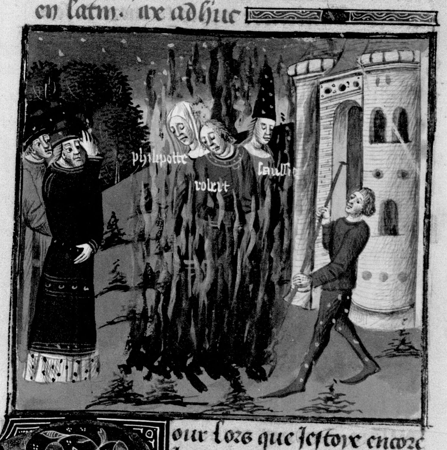 Parigi, Bibliothèque Nationale de France, Fr. 230, f. 271r. Il copista del manoscritto è P. Droulin. Filippa da Catania e i suoi due figli, Roberto e Sancia, vengono arsi sul rogo.