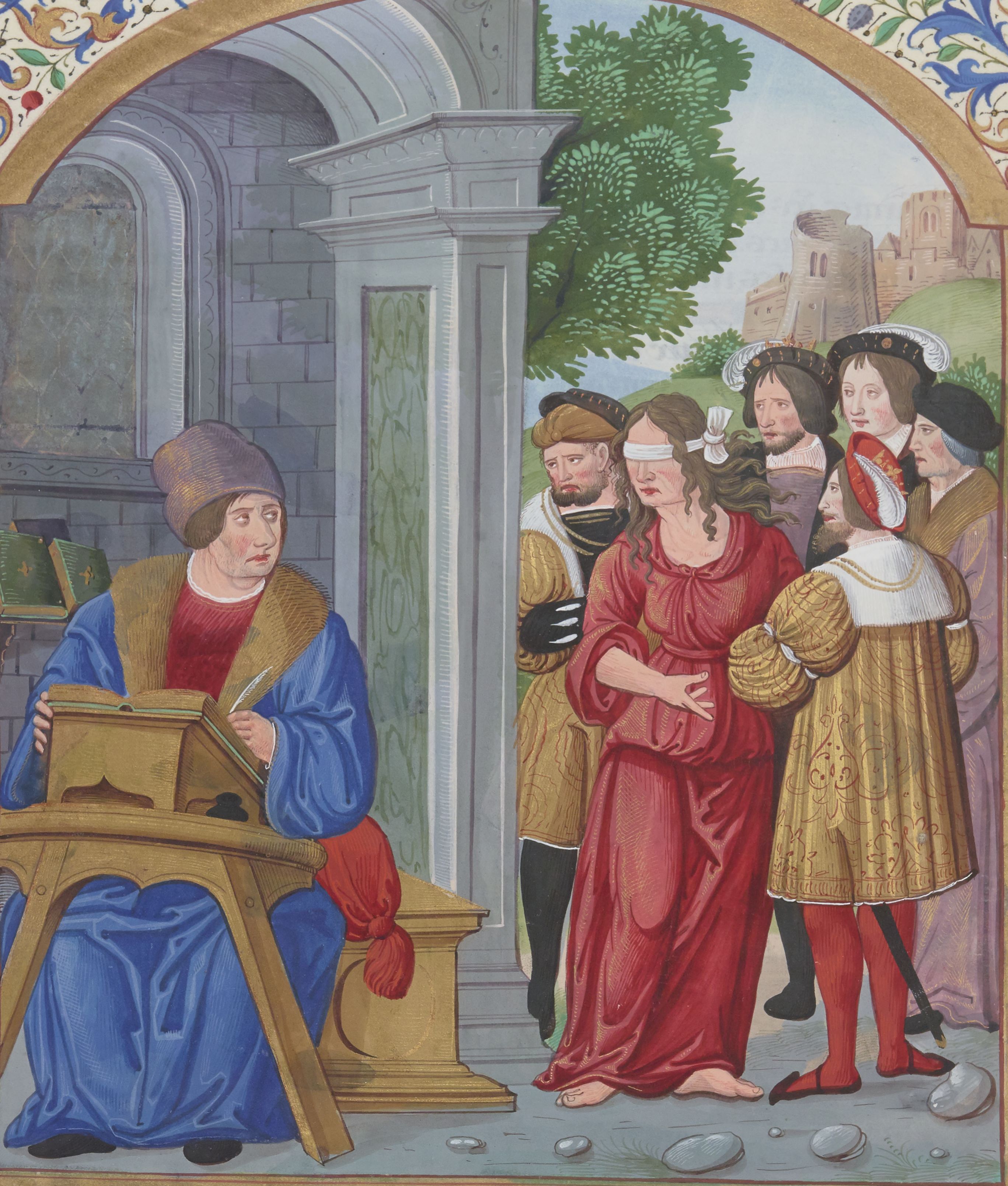 Parigi, Bibliothèque Nationale de France, Fr. 130, f. 233v. La Fortuna bendata presenta un gruppo di uomini colpiti dalla sfortuna a Giovanni Boccaccio, intento a scrivere nel suo studio.