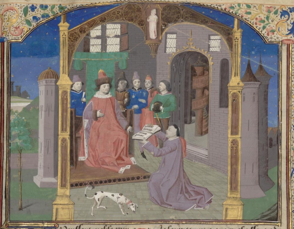 Parigi, Bibliothèque interuniversitaire Sainte-Geneviève, 1129, f. 1r. Nella sala del trono Laurent de Premierfait presenta il libro al re Carlo VI, circondato dai suoi consiglieri.