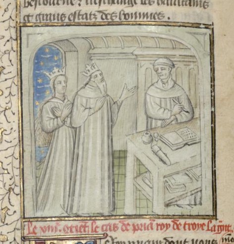 Parigi, Bibliothèque interuniversitaire Sainte-Geneviève, 1128, f. 24v. Priamo e d Ecuba compaiono dinanzi a Giovanni Boccaccio.