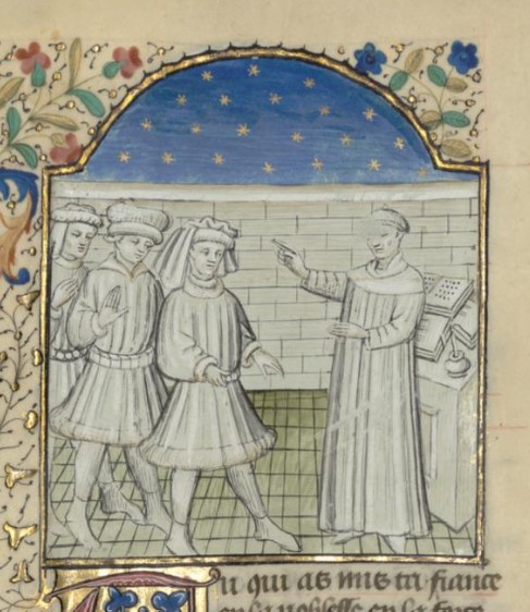 Parigi, Bibliothèque interuniversitaire Sainte-Geneviève, 1128, f. 27v. Giovanni Boccaccio si rivolge a tre sfortunati.