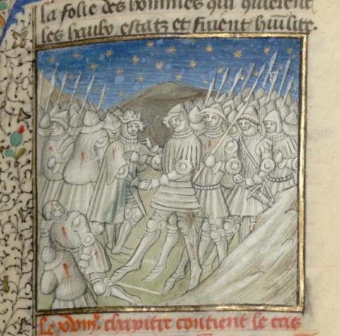 Parigi, Bibliothèque interuniversitaire Sainte-Geneviève, 1128, f. 59r. Ciro accetta la resa di Astiage dopo averlo sconfitto in battaglia.
