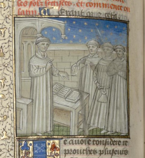 Parigi, Bibliothèque interuniversitaire Sainte-Geneviève, 1128, f. 99v. Giovanni Boccaccio incontra un gruppo di sfortunati.