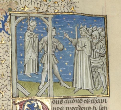 Parigi, Bibliothèque interuniversitaire Sainte-Geneviève, 1128, f. 108r. Malco fa impiccare suo figlio, il vescovo Cartalone.