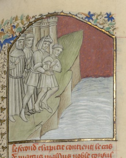 Parigi, Bibliothèque interuniversitaire Sainte-Geneviève, 1128, f. 117r. Marco Manlio Capitolino viene gettato nel Tevere.