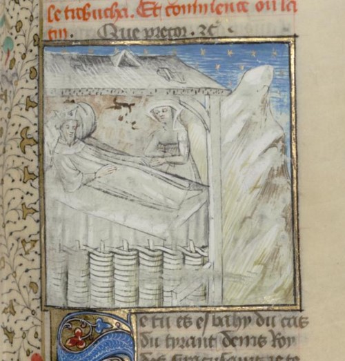 Parigi, Bibliothèque interuniversitaire Sainte-Geneviève, 1128, f. 123r. Dionigi di Siracusa giace morente nel letto, assistito da una donna.