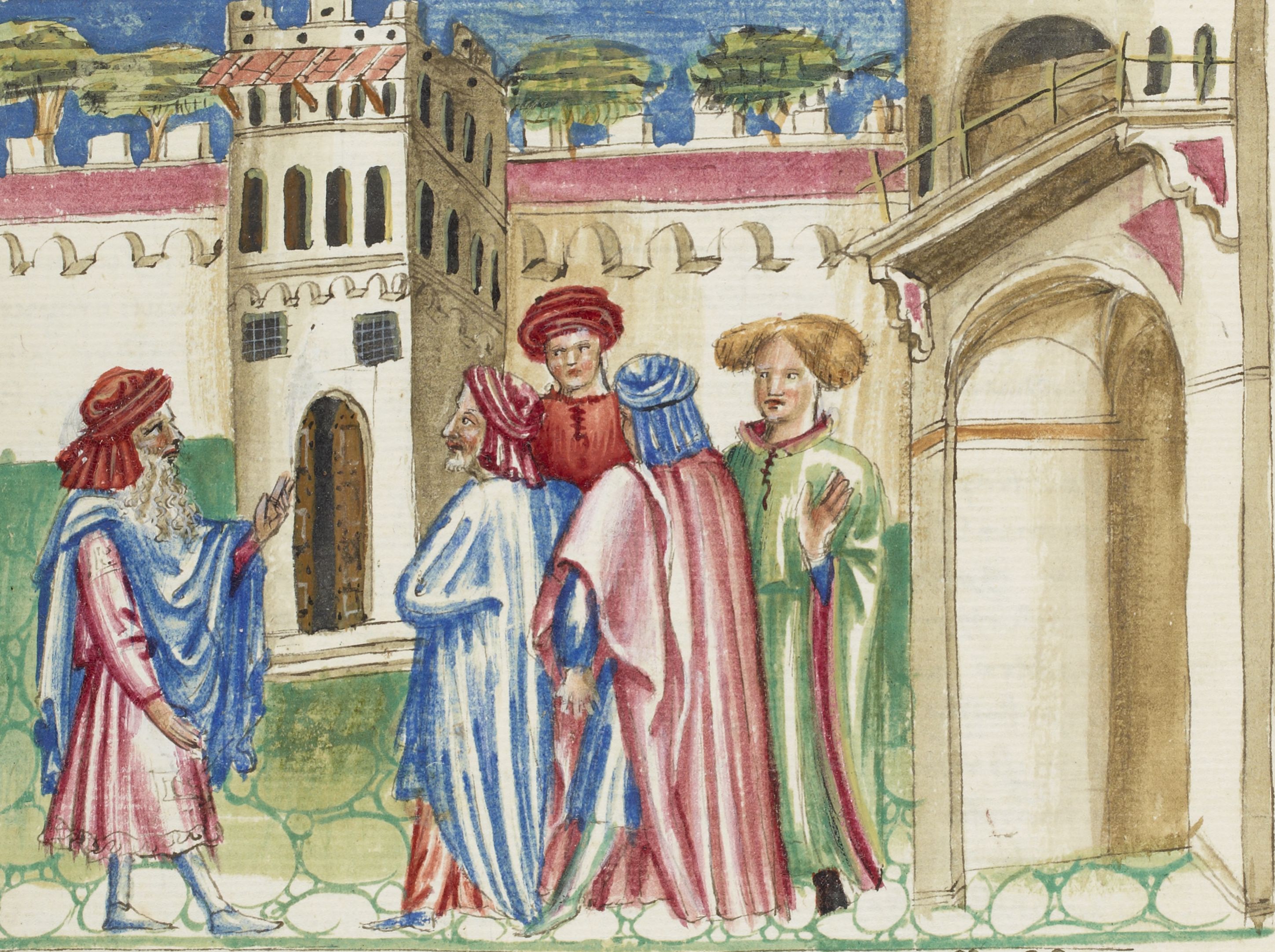 Parigi, Bibliothèque Nationale de France, It. 63, f. 28r. Il copista del manoscritto, datato 10 ottobre 1427, è Ludovico di Salvestro Ceffini. Ermino de' Grimaldi mostra la sua nuova casa a Guglielmo Borsiere ed altri nobili genovesi.