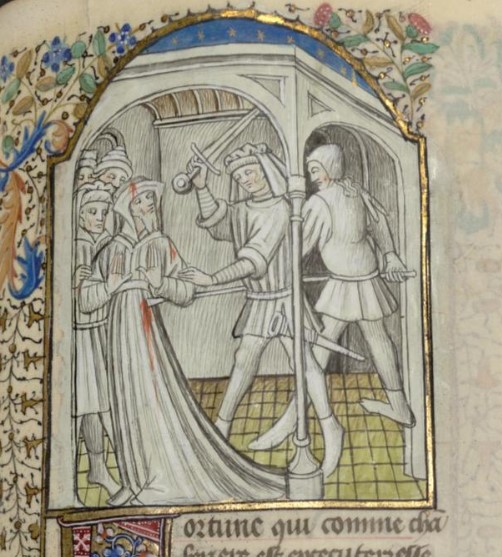 Parigi, Bibliothèque interuniversitaire Sainte-Geneviève, 1128, f. 184r. Ammonio, prefetto di Alessandro Magno, tenta di fuggire travestito da donna ma viene riconosciuto e assassinato.