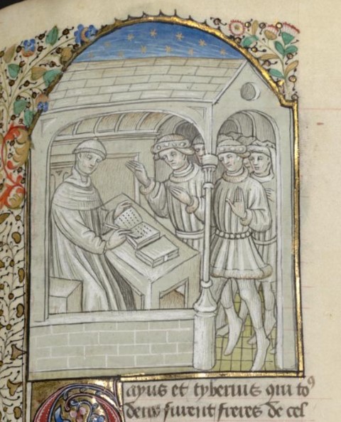Parigi, Bibliothèque interuniversitaire Sainte-Geneviève, 1128, f. 187r. Giovanni Boccaccio incontra un gruppo di sfortunati.