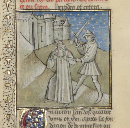 Parigi, Bibliothèque interuniversitaire Sainte-Geneviève, 1128, f. 212r. Mitridate III viene assassinato per ordine del fratello Orode.