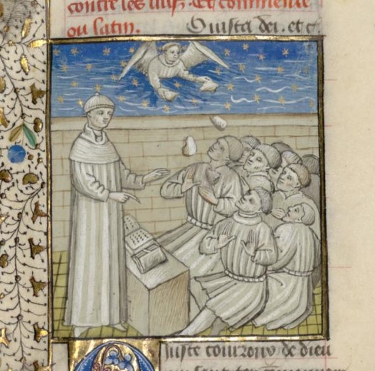 Parigi, Bibliothèque interuniversitaire Sainte-Geneviève, 1128, f. 266v. Giovanni Boccaccio si rivolge ad un gruppo di sfortunati colpiti dalle pietre scagliate da un angelo inviato dal Signore.