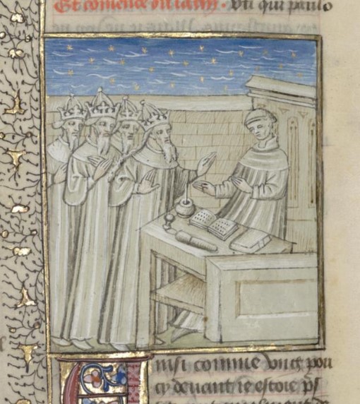 Parigi, Bibliothèque interuniversitaire Sainte-Geneviève, 1128, f. 281v. Giovanni Boccaccio incontra quattro imperatori.