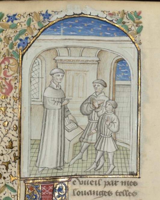 Parigi, Bibliothèque interuniversitaire Sainte-Geneviève, 1128, f. 337v. Giovanni Boccaccio illustra le virtù dell'amore paterno ad un padre con suo figlio.
