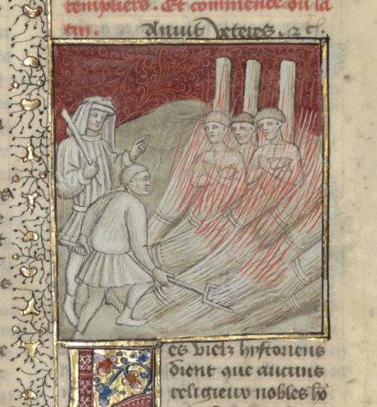 Parigi, Bibliothèque interuniversitaire Sainte-Geneviève, 1128, f. 342r. I cavalieri Templari vengono arsi sul rogo.