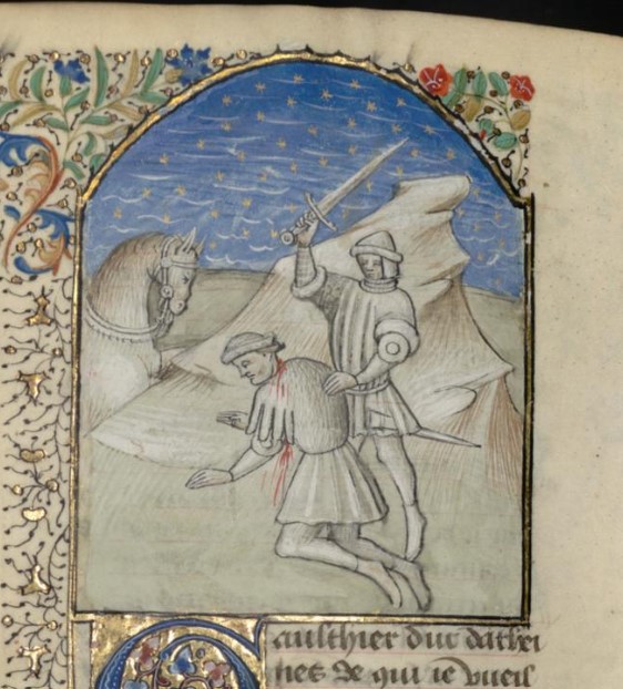 Parigi, Bibliothèque interuniversitaire Sainte-Geneviève, 1128, f. 347v. Gualtieri di Brienne, duca d'Atene, viene ucciso nella battaglia di Poitiers.