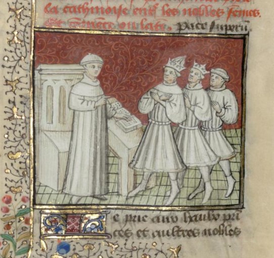 Parigi, Bibliothèque interuniversitaire Sainte-Geneviève, 1128, f. 351v. Giovanni Boccaccio incontra tre sfortunati.