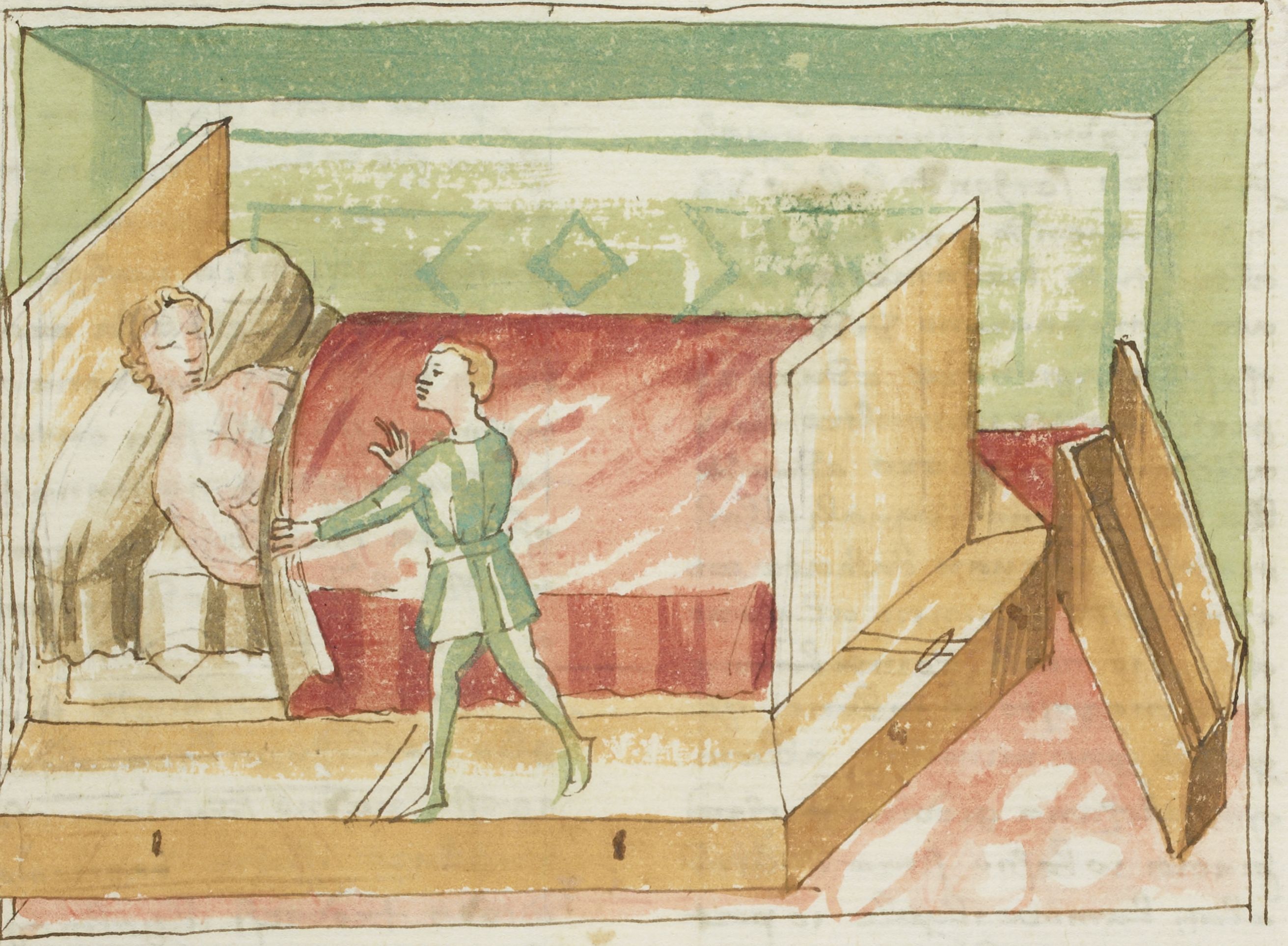 Parigi, Bibliothèque Nationale de France, It. 63, f. 78r. Il copista del manoscritto, datato 10 ottobre 1427, è Ludovico di Salvestro Ceffini. Uscito dalla cassa in cui era nascosto, Ambrogiuolo scosta il lenzuolo della moglie di Bernabò per osservarla mentre dorme.