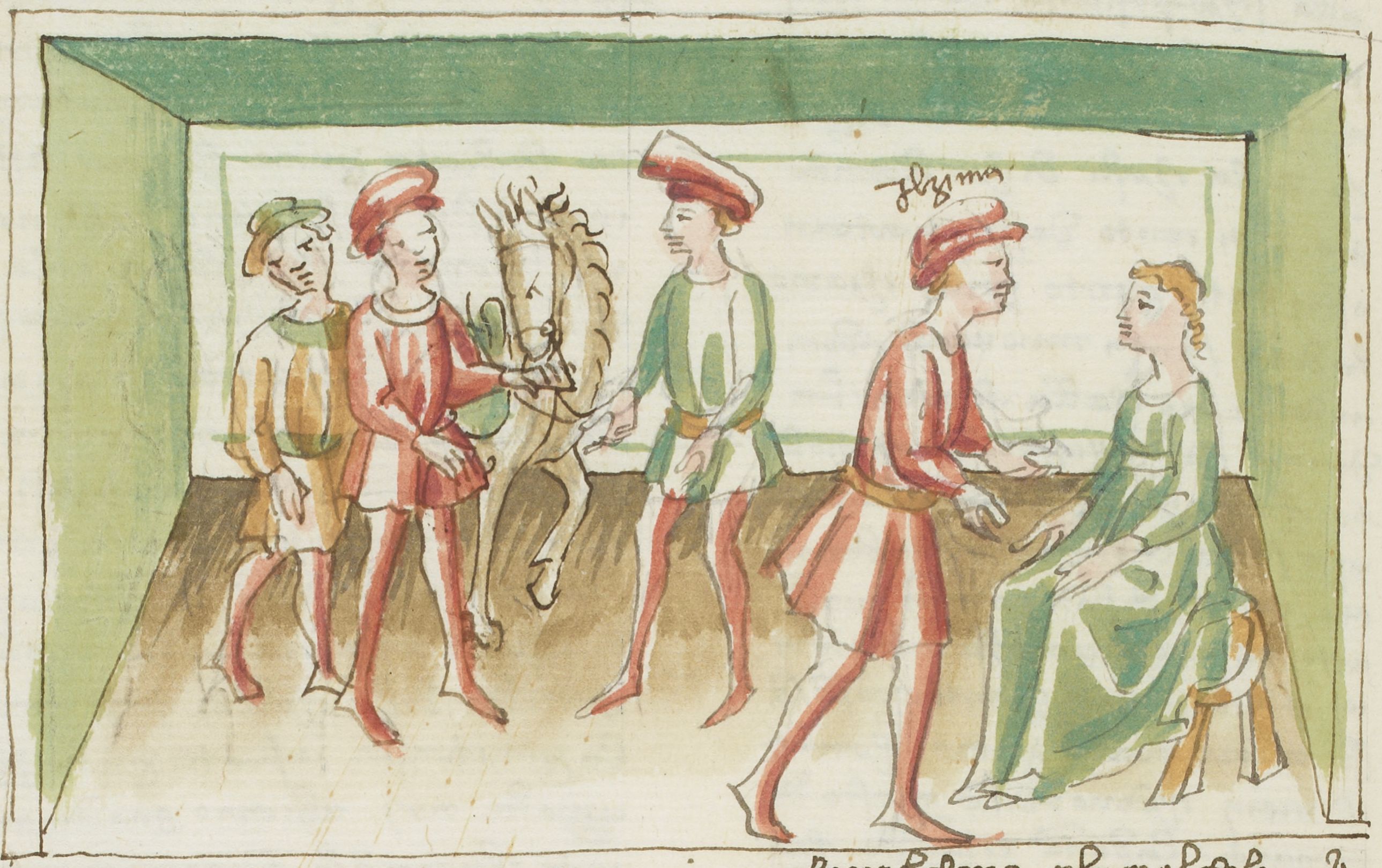 Parigi, Bibliothèque Nationale de France, It. 63, f. 103v. Il copista del manoscritto, datato 10 ottobre 1427, è Ludovico di Salvestro Ceffini. Zima cede un cavallo a Francesco Vergellesi, ottenendone in cambio di poter parlare con la moglie seduta su uno sgabello.