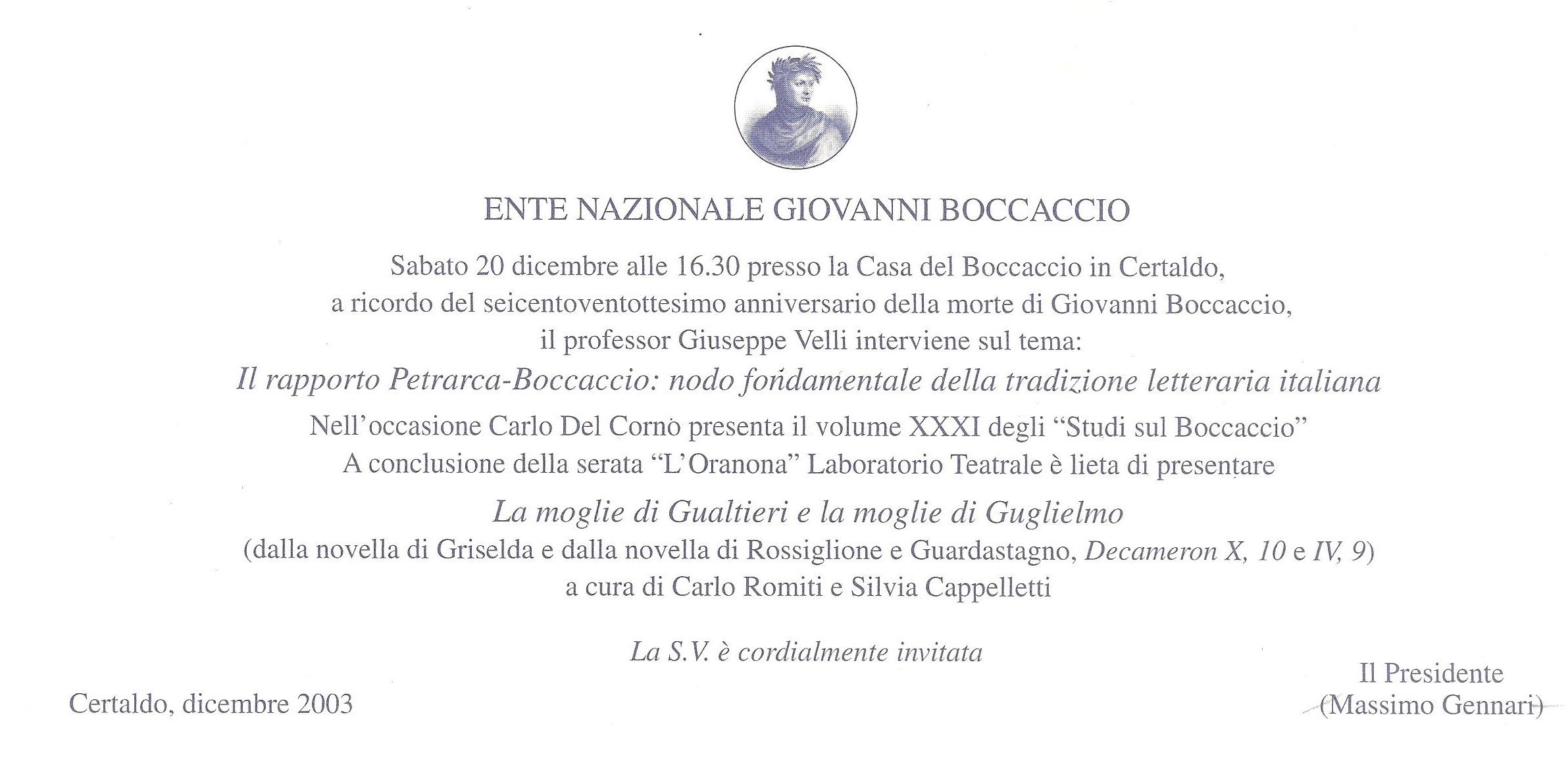 "Il rapporto Petrarca-Boccaccio: nodo fondamentale della tradizione letteraria" e presentazione del vol. XXXI degli "Studi sul Boccaccio"