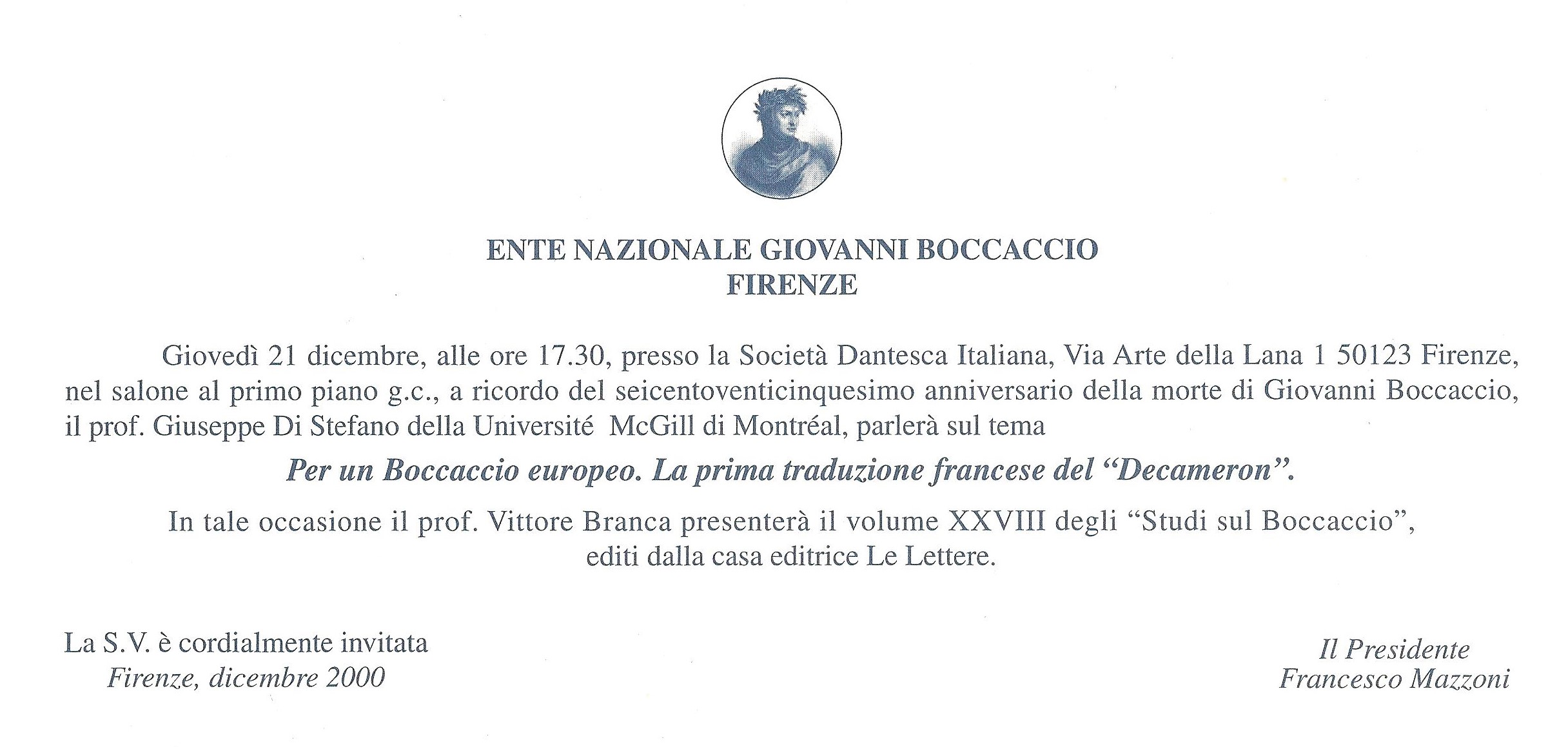 Il prof. Giuseppe di Stefano (Université McGill di Montréal) a ricordo del 625° anniversario della morte di Giovanni Boccaccio parlerà sul tema