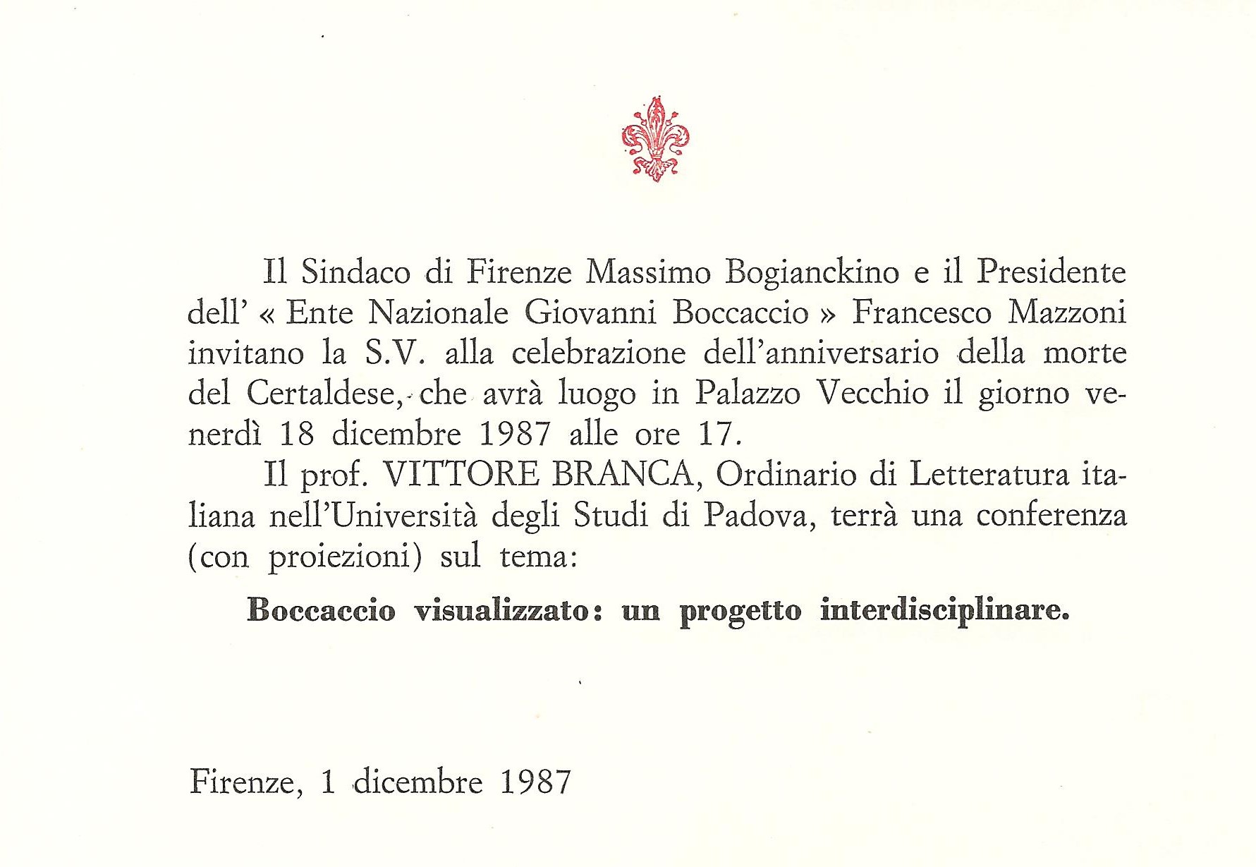 A ricordo dell'anniversario della morte di Giovanni Boccaccio, il prof. Vittore Branca (Università degli Studi di Padova) terrà una conferenza sul tema