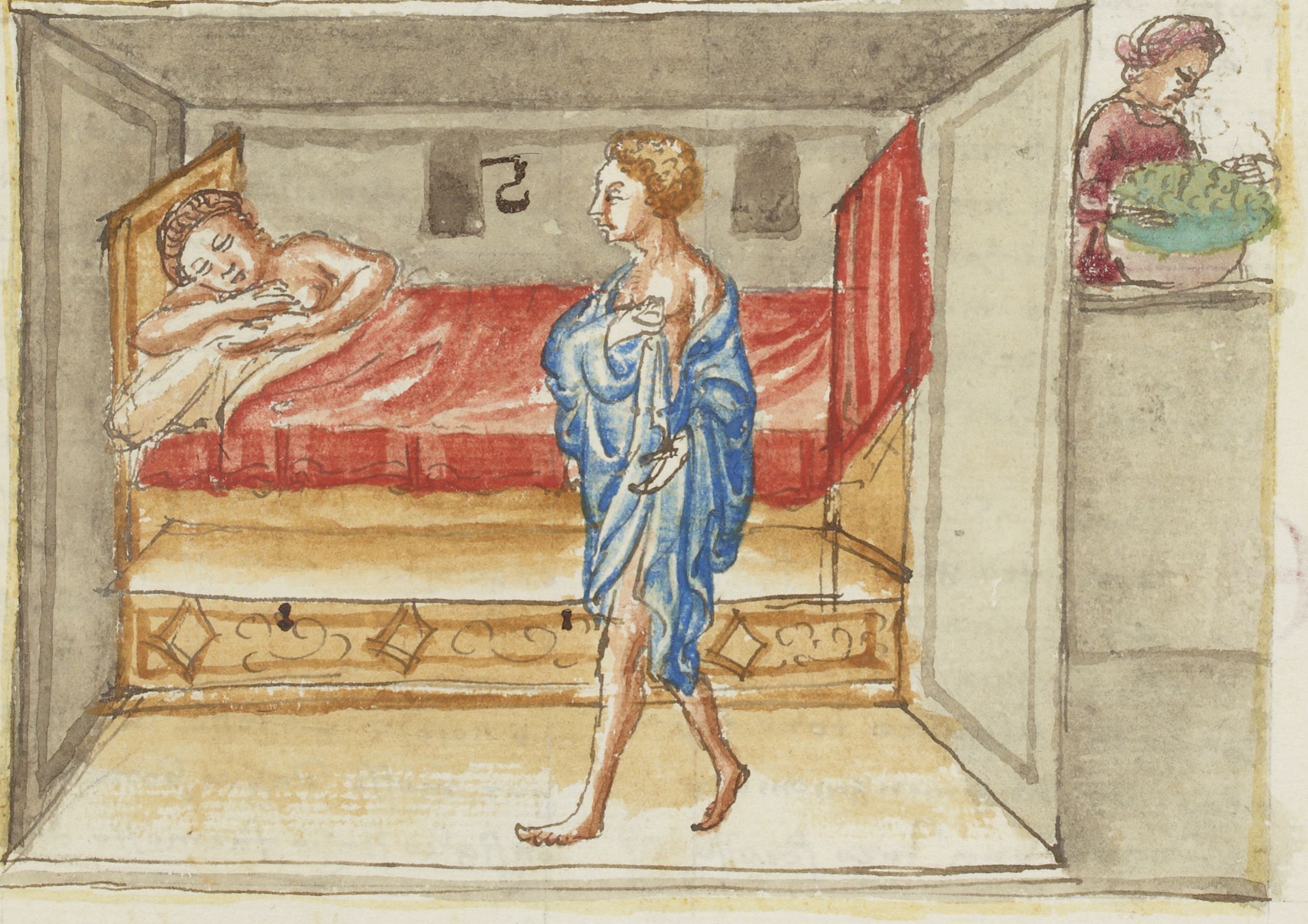 Parigi, Bibliothèque Nationale de France, It. 63, f. 148r. Il copista del manoscritto, datato 10 ottobre 1427, è Ludovico di Salvestro Ceffini. Lo spettro di Lorenzo appare a Lisabetta mentre dorme; la fanciulla piange sulla pianta di basilico.