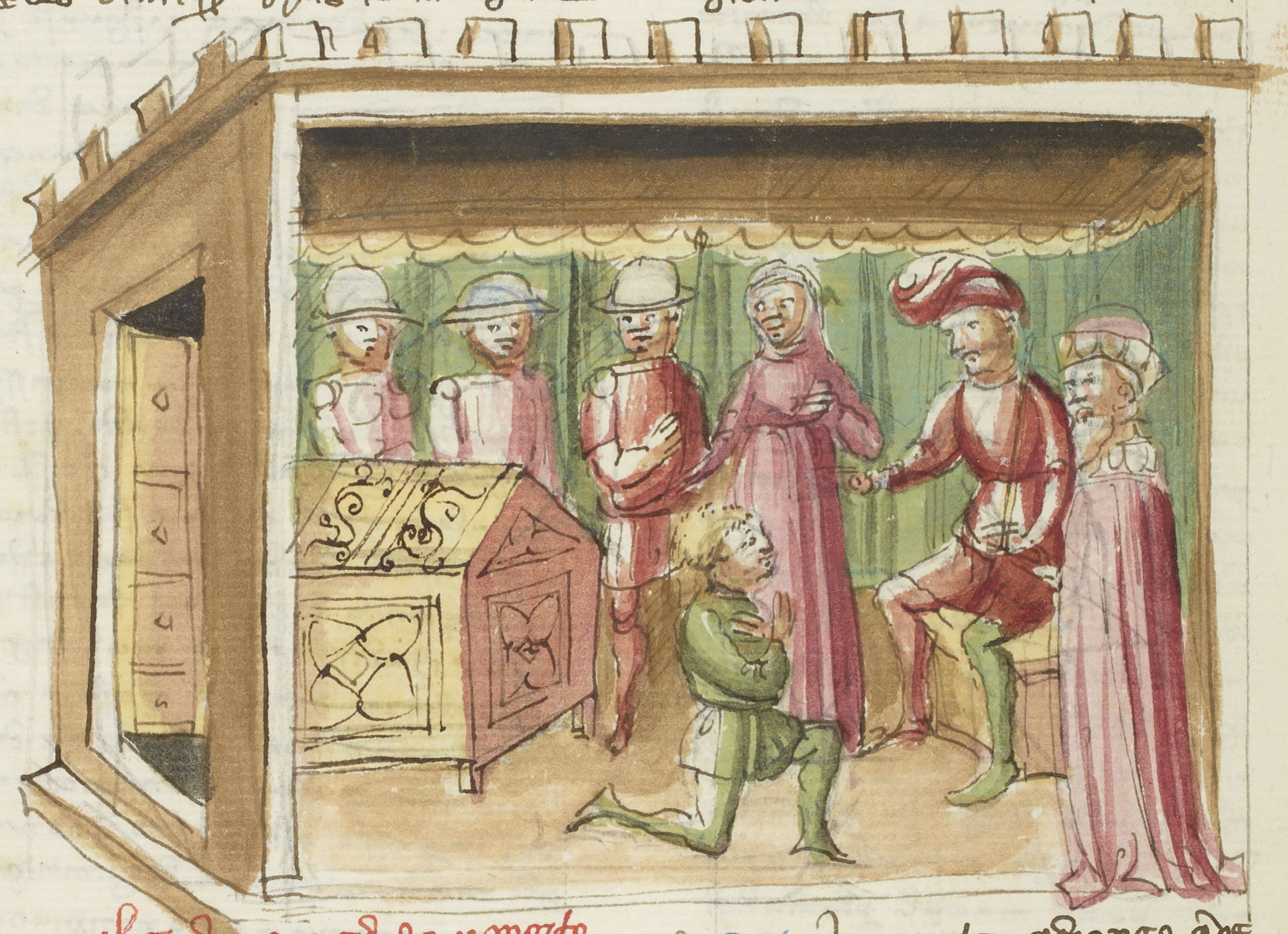 Parigi, Bibliothèque Nationale de France, It. 63, f. 159v. Il copista del manoscritto, datato 10 ottobre 1427, è Ludovico di Salvestro Ceffini. Ruggieri, accusato come ladro, viene scagionato dinanzi al giudice grazie alle spiegazioni della fante.