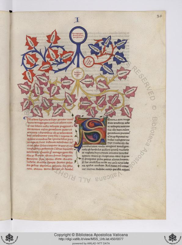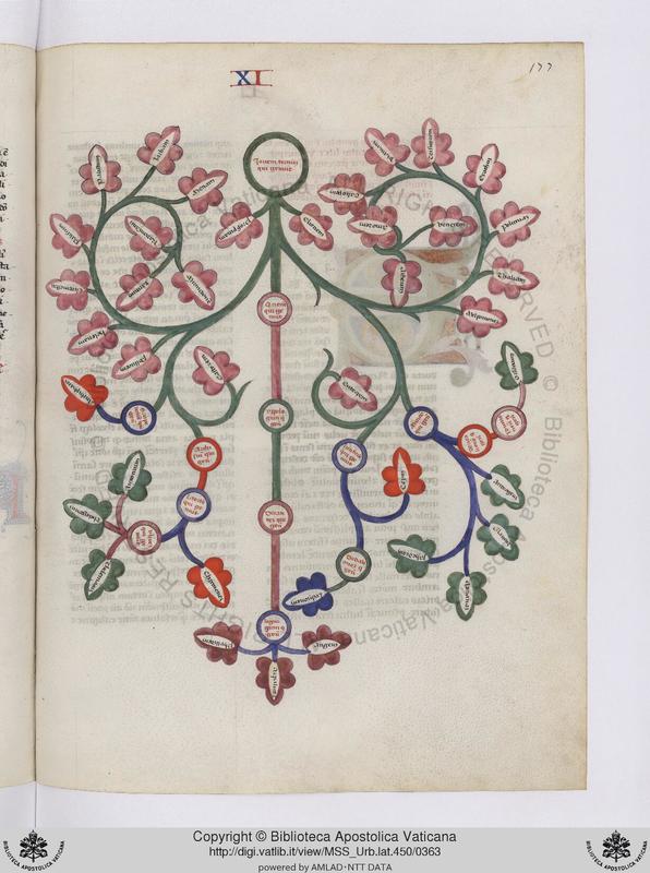 Città del Vaticano, BAV, Urb. lat. 450, f. 74r. Albero genealogico di Celo e Titano.
