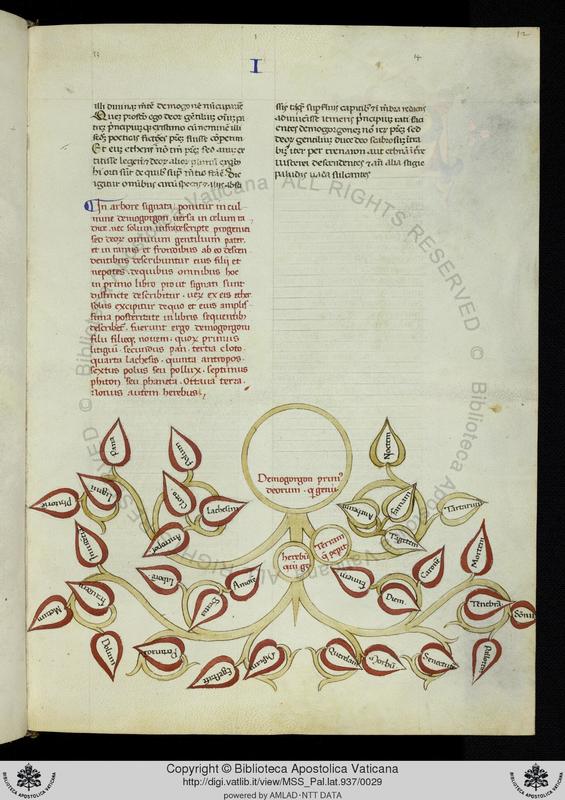 Città del Vaticano, BAV, Pal. lat. 937, f. 12r. Albero genealogico di Demogorgone.