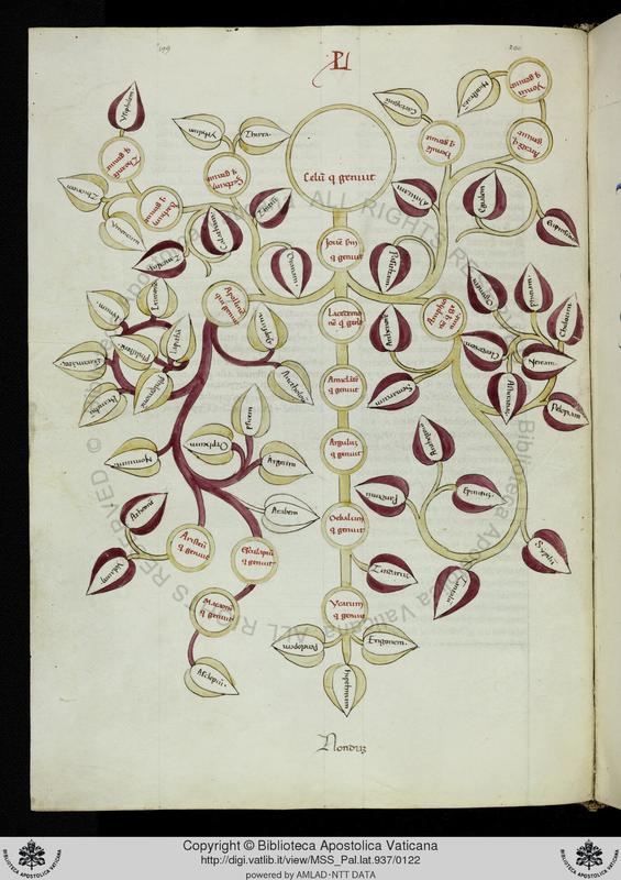 Città del Vaticano, BAV, Pal. lat. 937, f. 43r. Albero genealogico di Celo e Titano.