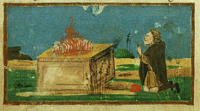 Firenze, Biblioteca Riccardiana, Ricc. 1503, f. 94v. Il copista del manoscritto, datato 1482, è Nicola Mangona. Girafone e Alimena siedono accanto alla pira funebre del figlio Afri…