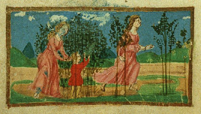 Firenze, Biblioteca Riccardiana, Ricc. 1503, f. 104v. Il copista del manoscritto, datato 1482, è Nicola Mangona. Mensola nasconde il figlio Pruneo tra i cespugli.