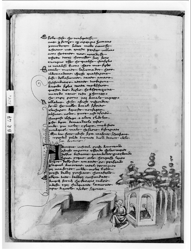 Firenze, Biblioteca Nazionale Centrale, B. R. 47, f. 101v. Africo siede malinconico accanto ad una fonte.